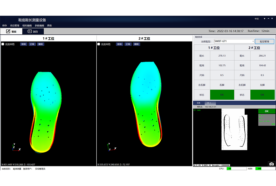 大底3D智能檢測系統(tǒng)基于線激光掃描3D相機(jī),搭載自主研發(fā)的3D視覺軟件,對大底進(jìn)行智能碼數(shù)識別和左右腳判斷。線激光掃描3D相機(jī)獲取深度圖后,通過3D視覺軟件進(jìn)行數(shù)據(jù)處理,給出大底的長寬高尺寸,然后判斷大底碼數(shù)和左右腳,對不在碼數(shù)要求尺寸范圍內(nèi)的大底進(jìn)行剔除。
